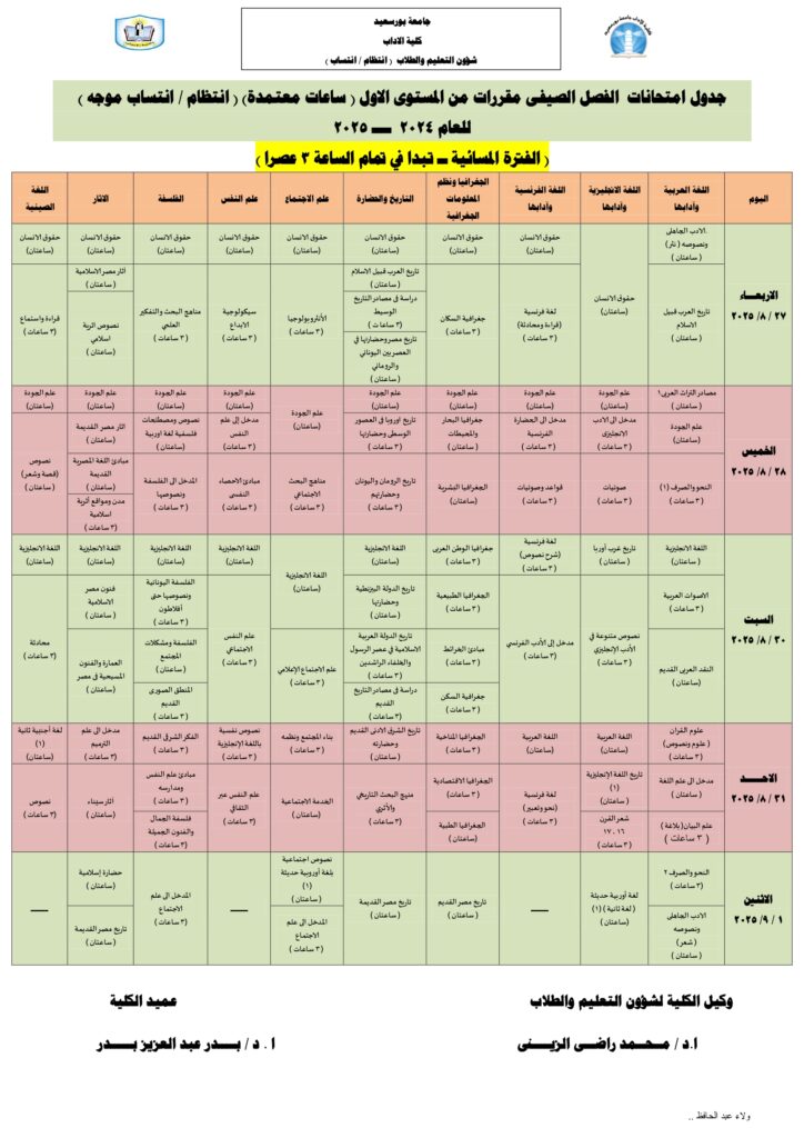 جدول امتحانات الفصل الصيفى مقررات من المستوى الاول ( ساعات معتمدة) ( انتظام / انتساب موجه ) للعام 2024 ــــ 2025بواسطة test test / أغسطس 27, 2025
